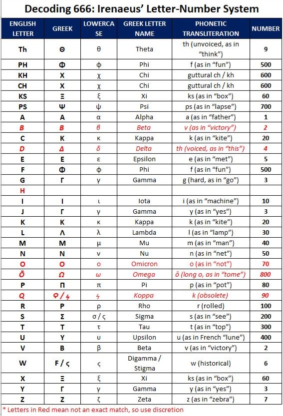 Irenaeus, a 2nd-century church leader and student of Polycarp (who studied under the Apostle John), explained that the number 666 in the Book of Revelation comes from adding the numeric values of Greek letters in a name. This Excel document can help — simply enter a name, and it will use the Greek letters with their corresponding numbers to calculate the name.